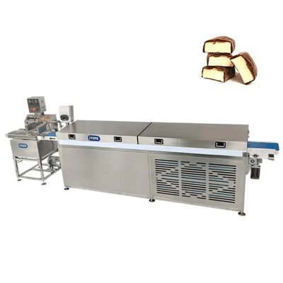 Description of the Small chocolate enrobing machine The commercial full automatic Small chocolate enrobing machine is the special machine for enrobing different kinds of products such as cereal bars, energy bars, protein bars, candy bars, rice bites, wafers, and wafer sticks, birthday cakes, cakes, bread, rolls, pies, muffins, snacks, candies, confectionery, maamoul and mooncakes, cookies, biscuits, crackers, cake ball, date ball and chocolate truffles, mochi, dates, strawberries and other fruits, etc. The Small Chocolate Enrober Machine coordinates with the chocolate cooling fan to make the final products high-quality and beautiful surface.